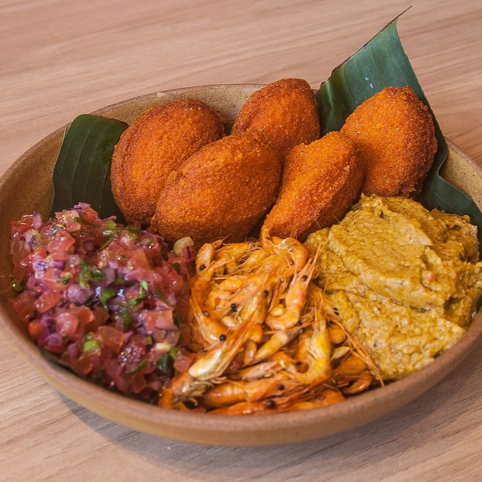 Quinteto de acarajés, vatapá, camarões secos e molho lambão