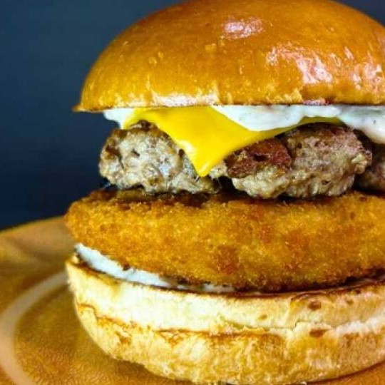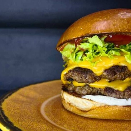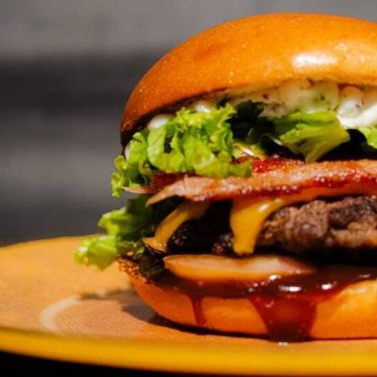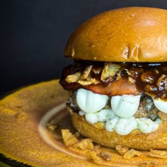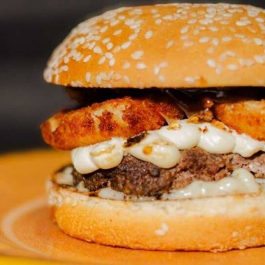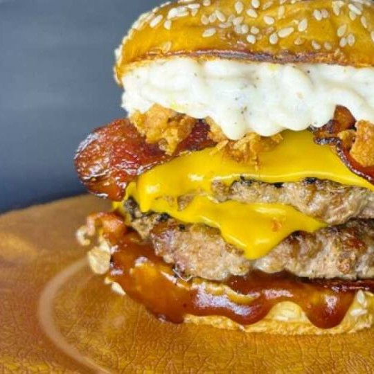 Pão com gergelim, duas carnes artesanais de 100g cada, 2x queijo, 1x cheddar, bacon, calabresa, bacon, 2x onion rings, barbecue e molho da casa.