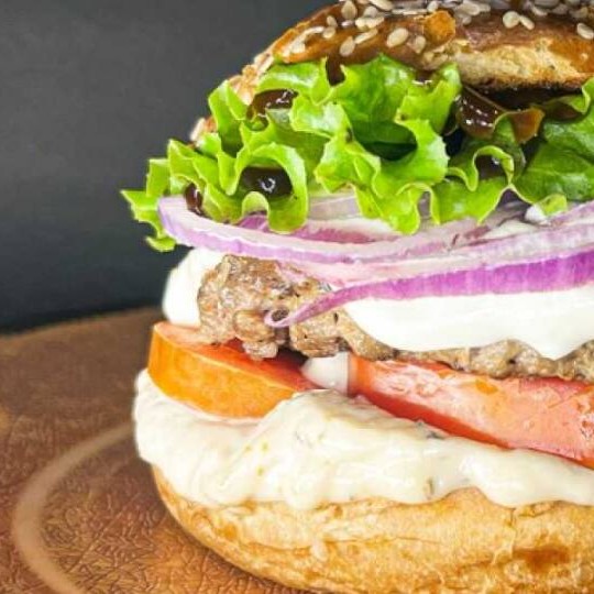 Pão com gergelim, 100g de carne artesanal, queijo coalho, bacon, cebola caramelizada, barbecue e molho da casa.