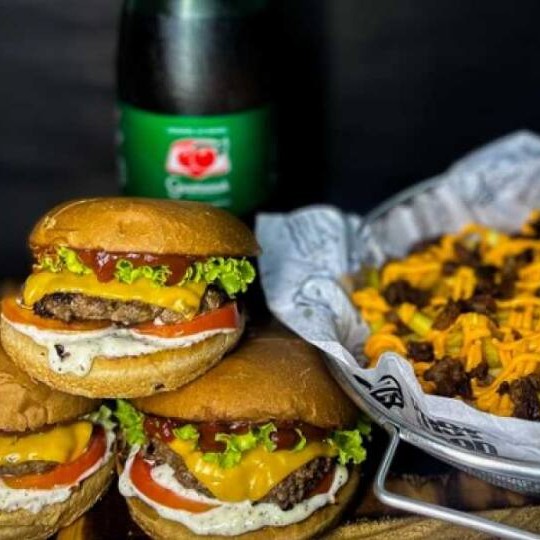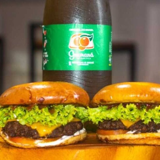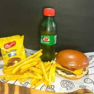 3 x-burguer Pão bola, 100g de carne artesanal, queijo, salada e molho da casa.+ uma porção de batata (250g) + 1 antártica de 1l.