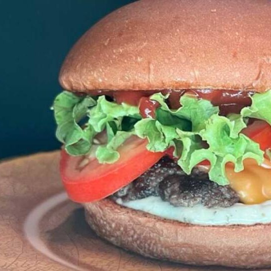 Pão bola, 100g de carne artesanal, queijo, ovo, tomate, alface, ketchup e molho da casa.