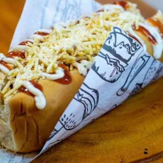 Pão 15cm, salsicha, tomate, cebola, milho com ervilha, ketchup, maionese da casa, queijo ralado e batata palha.