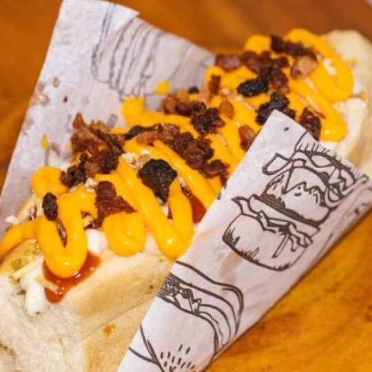 Pão 15 cm, salsicha, cheddar cremoso, bacon crocante, tomate, cebola, milho com ervilha, ketchup, molho da casa, queijo ralado e batata palha.