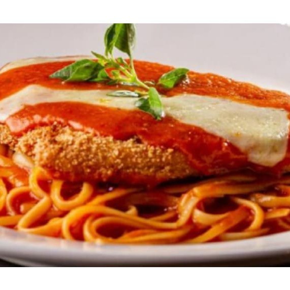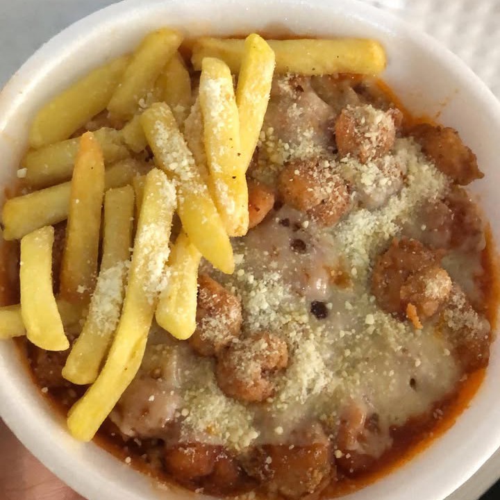 Marcarrão com molho de tomate caseiro peito de frango empanado com Queijo mussarela e queijo ralado e de brinde Batata frita