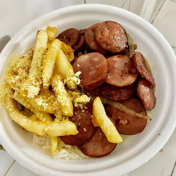 02 refeições de calabresa Arroz feijão macassar vinagrete e fritas