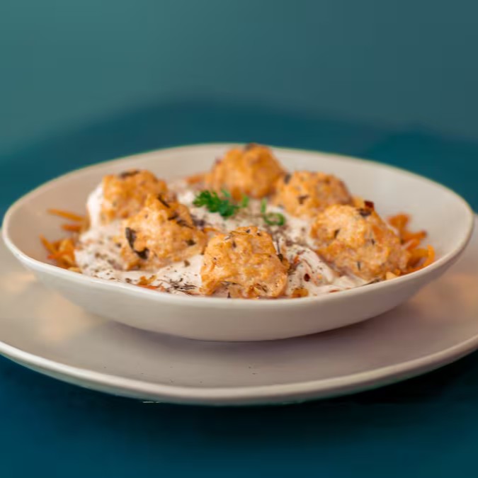 Almôndega de frango, servido com molho de ricota e penne sem glúten ou espaguete de legumes.