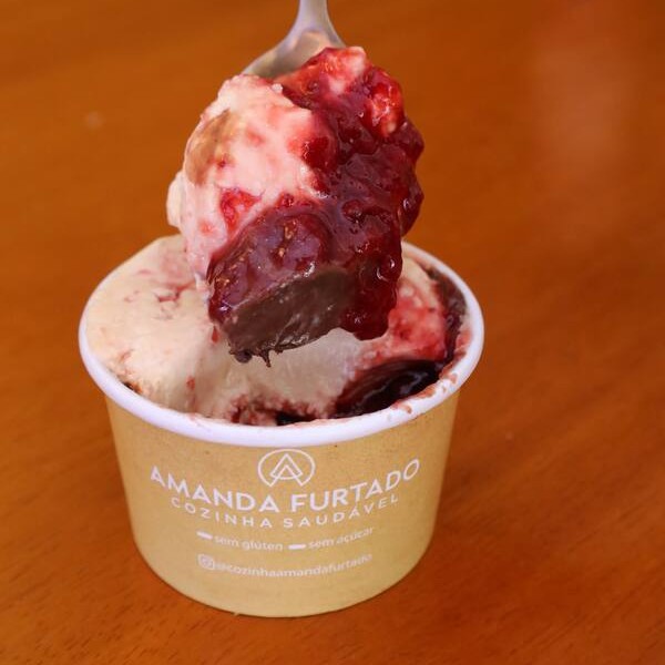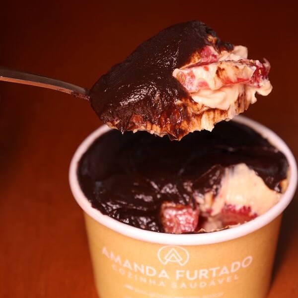 Delicioso pote sem açúcar recheado com brigadeiro proteico, brigadeiro branco e geleia de morango.