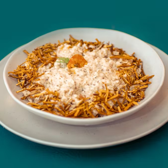 Massa fina feita com grão de bico e amêndoas, recheada com camarão e molho branco, finalizado com queijo gratinado.