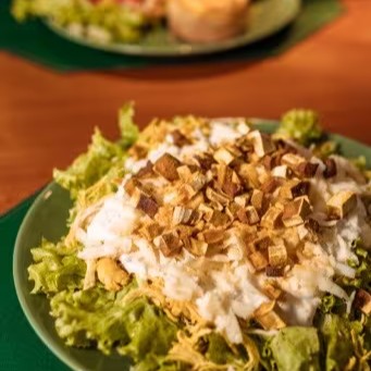 Nossa releitura da clássica Caesar: alface fresca, frango desfiado e temperado com equilíbrio, coberto com batata palha crocante de batata-doce — um toque especial da casa.