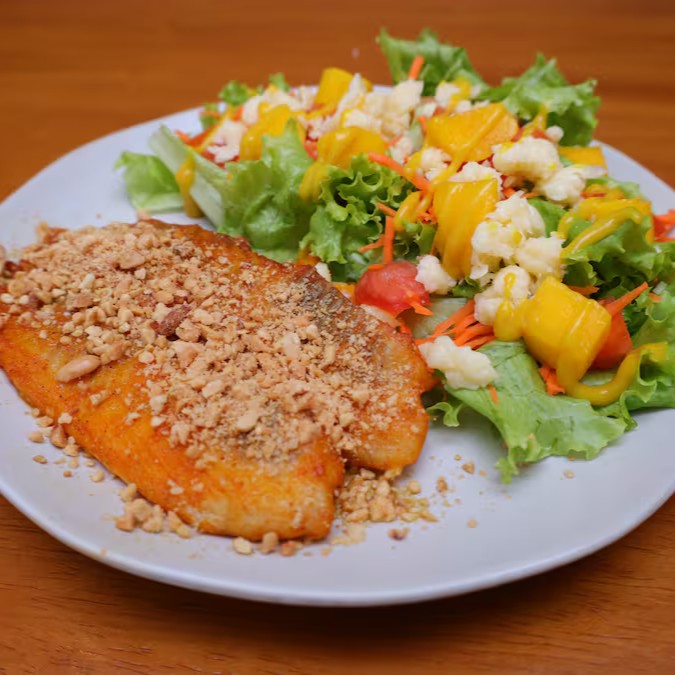 Alface, cenoura, tomate e manga combinados com queijo, molho de mostarda e tilápia assada no forno, finalizada com pesto e amendoim triturado. Uma explosão de sabor e leveza em cada garfada!