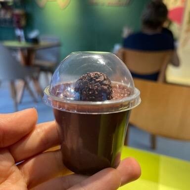 Delicioso brigadeiro proteico finalizado com nibs de cacau. Porção ideal para o Dia a Dia.