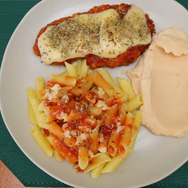 Nosso incrível parmê saudável feito com filé de peito empanado na farinha de amêndoas, com molho de tomate e queijo, acompanhado de purê de batata doce e espaguete de legumes ou penne sem glúten.