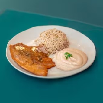 Tilápia feita no forno acompanhada com arroz de brócolis e purê de batata doce.