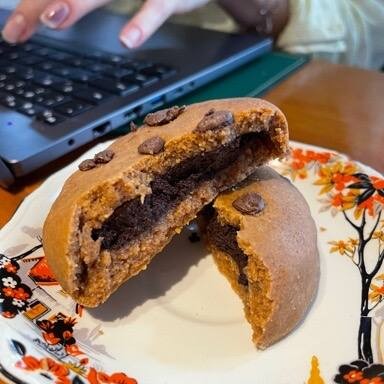 Massa artesanal feita com mix de farinhas sem glúten e adoçante natural recheado com ganache de chocolate 70%