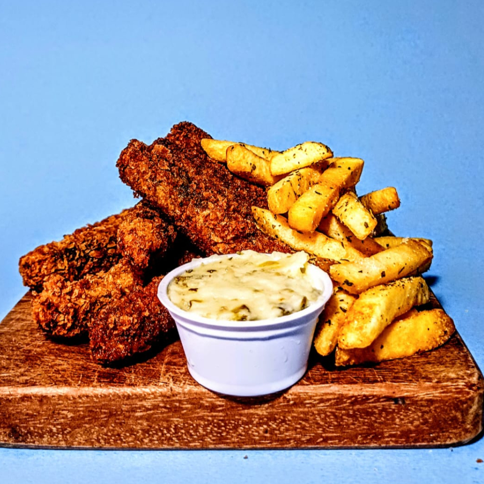 8 iscas de tofu enroladas com nori e empanadas com panko, acompanham batata frita e molho tártaro. Contém glúten