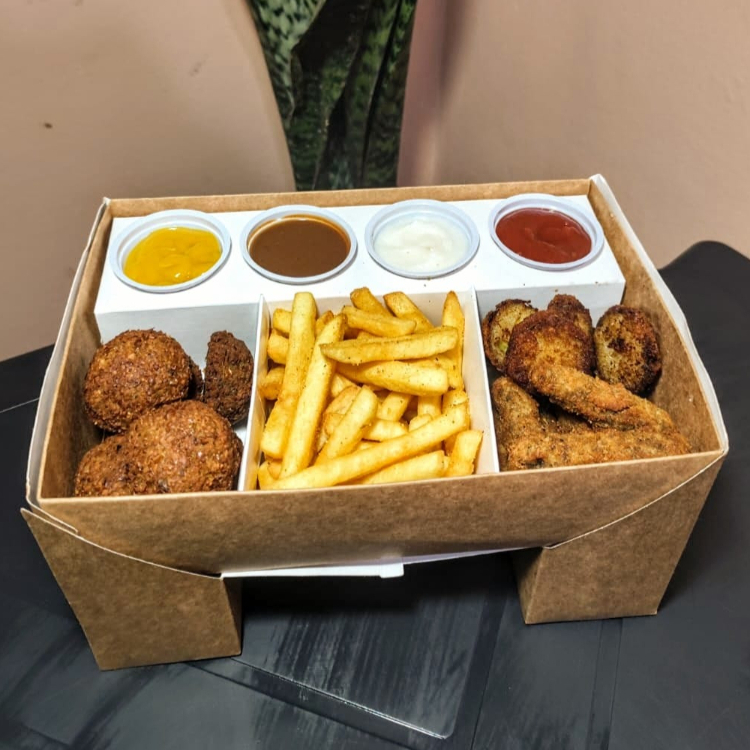 Pra dividir com os amigos tomando uma, ou pra assistir uma série com o love. Nossa caixinha vem com batata frita (200g), 8 bolinhos de falafel, 8 iscas de tofu empanadas, 8 moedinhas de picles de pepino empanadas (novidade ein!!!) e 4 molhos pra chuchar a Sua escolha!