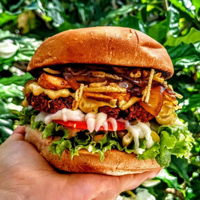 Burger amanita, cheddar cremoso vegano, alface, tomate, milho, maionese de alho, cebola no shoyo, tiras banana da terra frita e batata palha