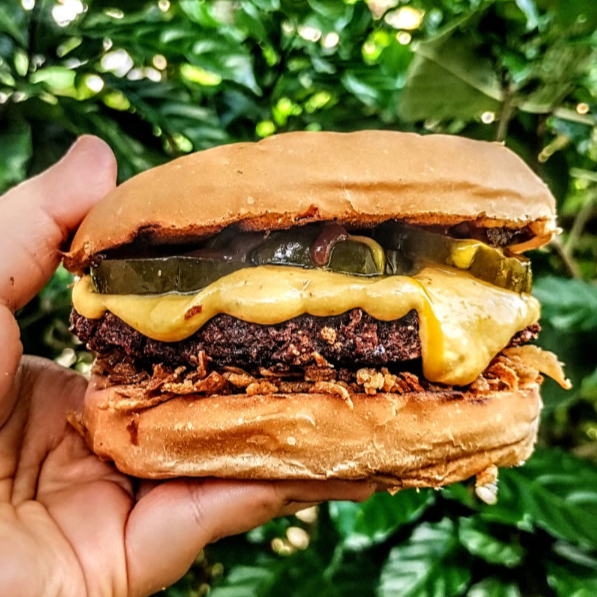 Burger Amanita, cheddar cremoso vegano, picles de pepino feito na casa, crispy de cebola, molho barbecue e mostarda. obs: a crispy de cebola contém glúten