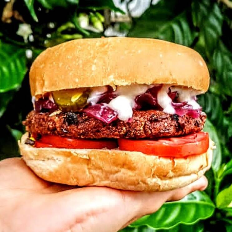 Burger Amanita, cheddar cremoso vegano, picles de cebola roxa, tomate e pesto de manjericão, no pão sem glúten. obs:pode conter traços de glúten