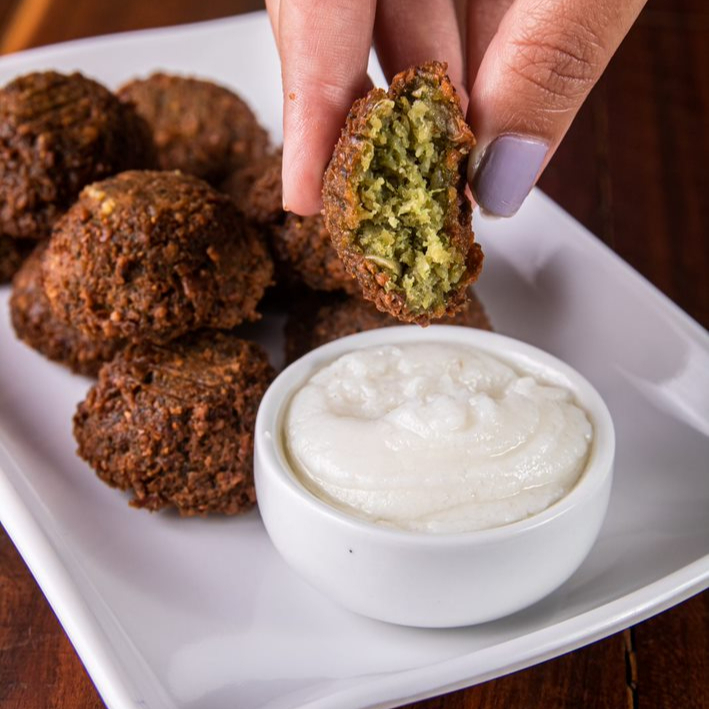 Bolinhos de grão de bico, acompanha maionese de alho. Porção com 10 unidades. Não contém glúten