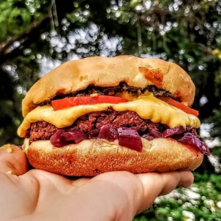 Burger amanita, cheddar cremoso vegano, picles de cebola roxa, molho pesto e tomate