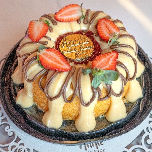 Massa Génoase, mousse Ninho, finalizada com calda moça quente e polvilhada com leite Ninho em pó.