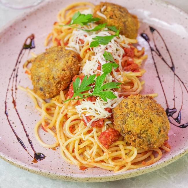POLPETONE CROCANTE DE CARNE EMPANADA E RECHEADO COM QUEIJO, AO MOLHO POMODORO COM ESPAGUETE