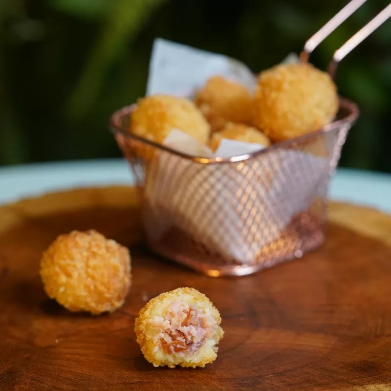 Deliciosos bolinhos de massa de batata e recheio de calabresa. 08 unidades