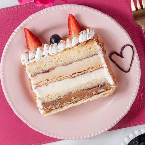 Criação da nossa chef Annie. Sabor único e super autêntico. Torta de baunilha com massa folhada, recheio de doce de leite, cream cheese e creme branco com geleia artesanal de frutas vermelhas e chantininho. (Selo queridinho da casa)