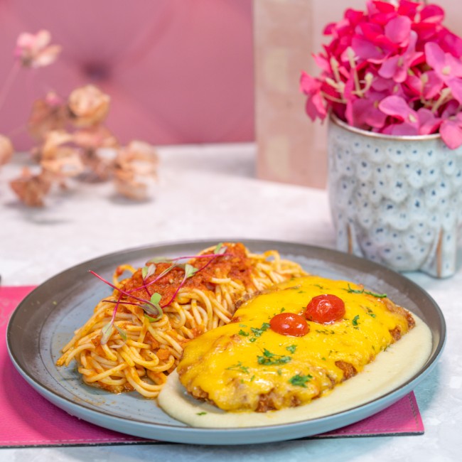 Clássico e irresistível: espaguete al dente ao molho pomodoro, acompanhado de suculento filé de carne empanado, coberto com queijo derretido e finalizado com Purê de batata .