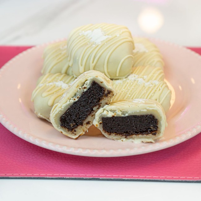 Brownie encapsulado com brigadeiro de ninho, banhado no chocolate nobre branco