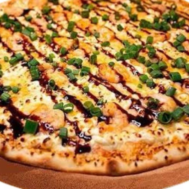 Massa Artesanal, Molho de Tomate, Queijo Mussarela, Filé de Camarão, Cream Cheese, Molho Teryaki e Cebolinho