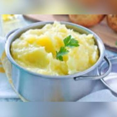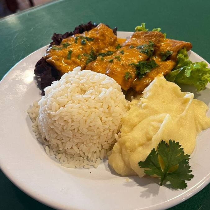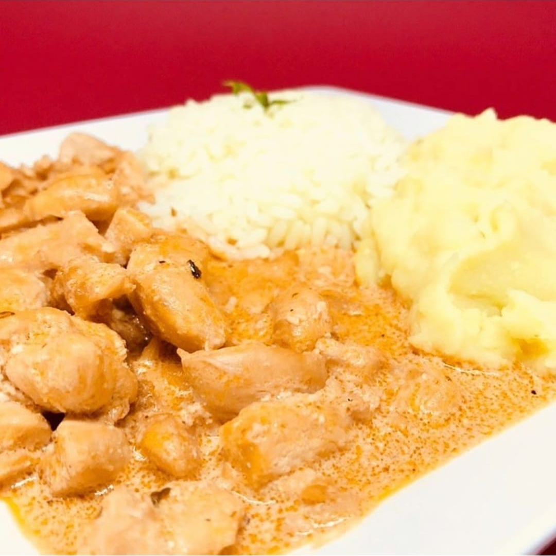 Frango desfiado, arroz, molho branco cremoso e batata frita.