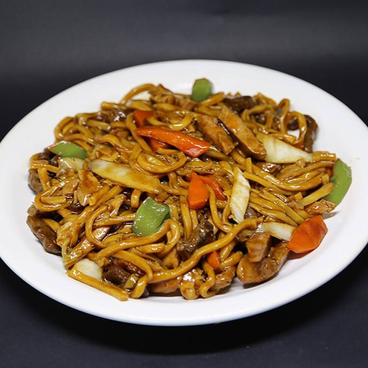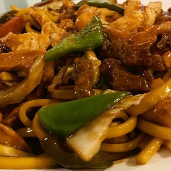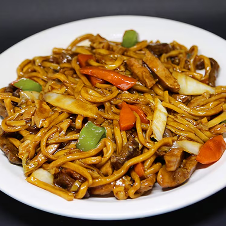 Legumes, macarrão, carne, frango e molho a base de shoyu.