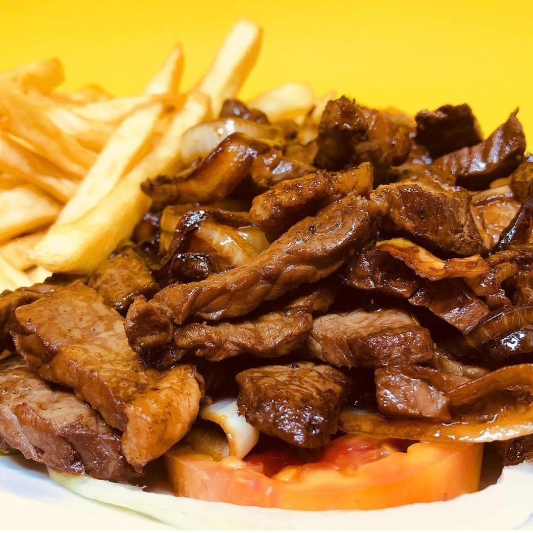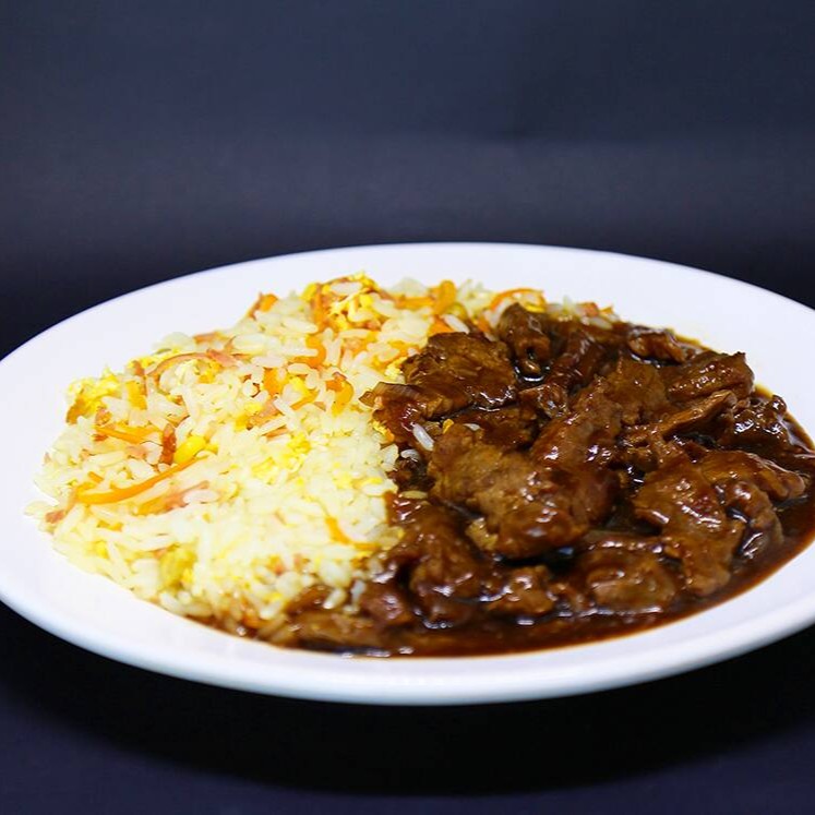 Iscas de carne acebolada, molho a base de shoyu e arroz cho suey,