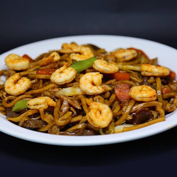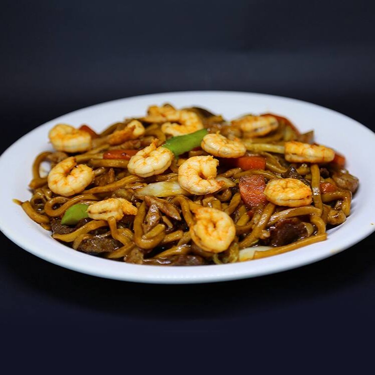Legumes, macarrão, carne, frango, camarão e molho a base de shoyu.