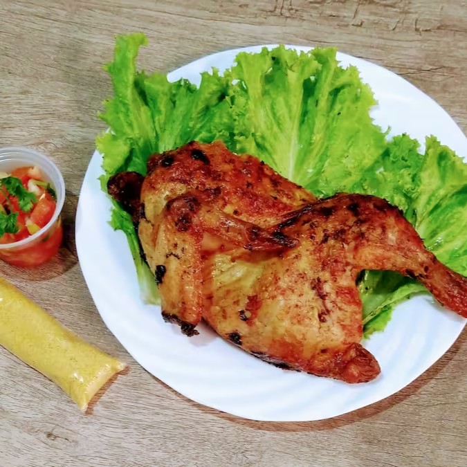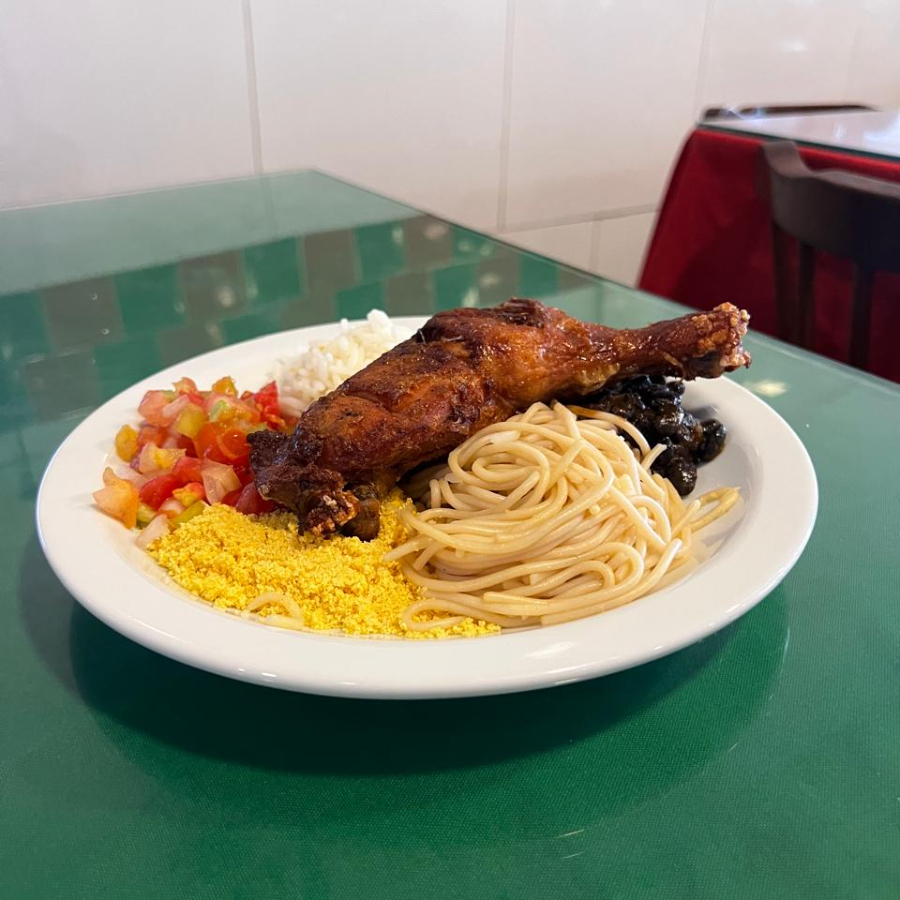Galeto, feijão, arroz, espaguete, vinagrete e farofa.