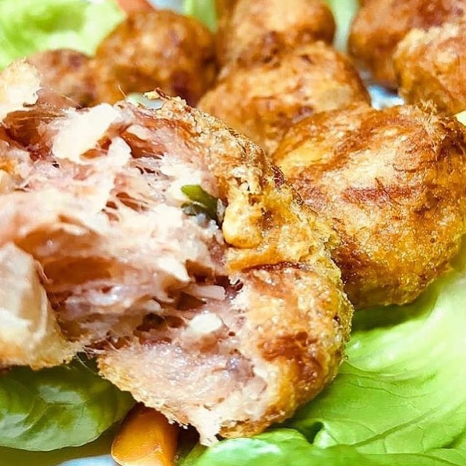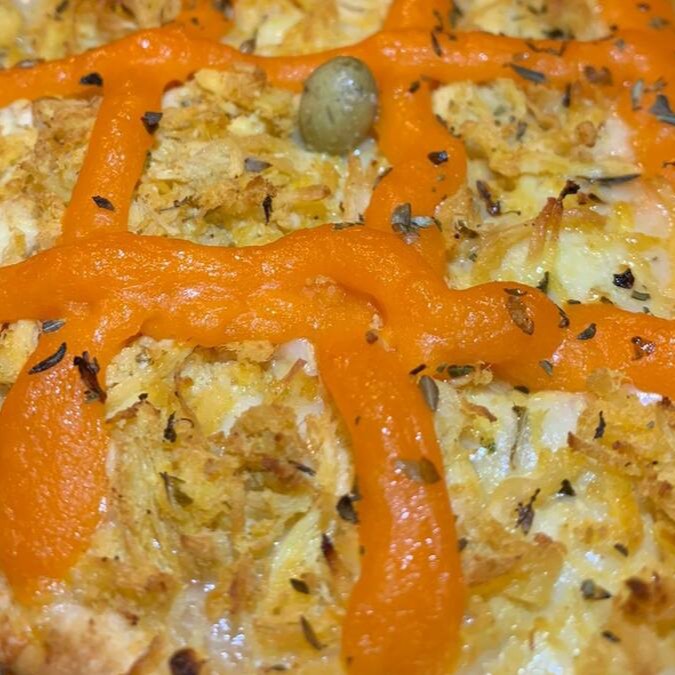Frango desfiado, massa, queijo, presunto e molho de tomate.