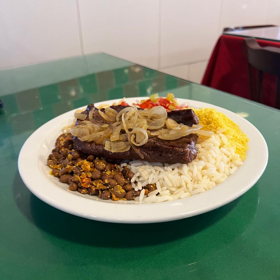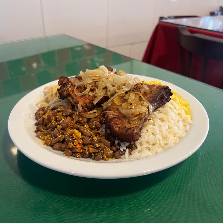 Cupim, feijão, arroz, batata frita, vinagrete e farofa.