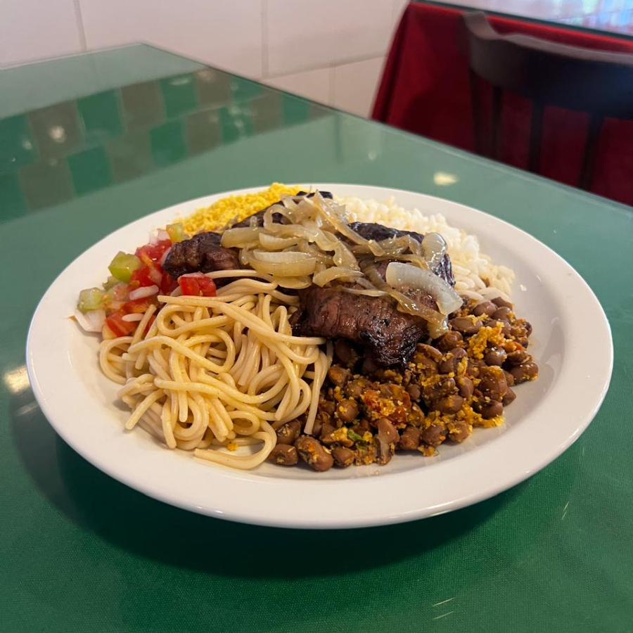 Picanha, feijão, arroz, espaguete, vinagrete e farofa.