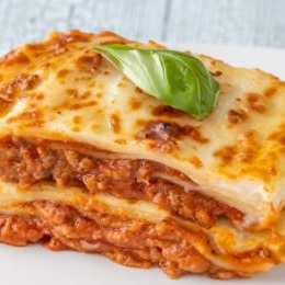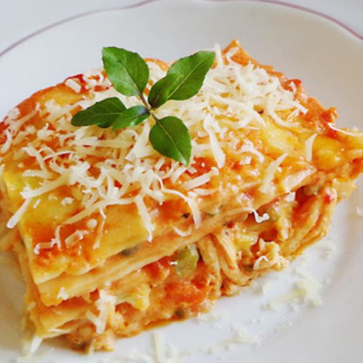 Carne moída, massa, queijo, presunto e molho de tomate.