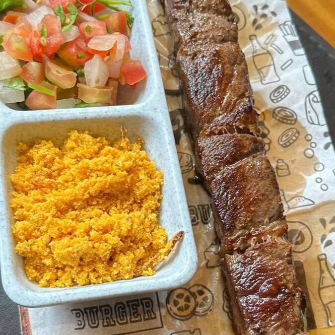 Maminha em cubos puxada no azeite, cebola e queijo coalho. Acompanhada de feijao tropeiro, arroz maluco, batata frita ou pure