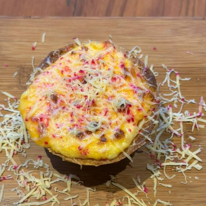 Queijo manteiga, banana caramelizada, açucar e canela.