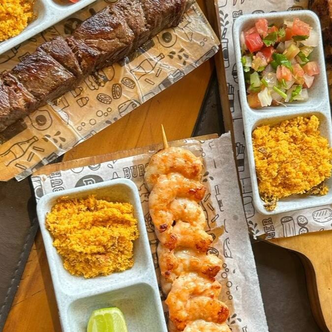 File de camarao puxado no dendê, charque desfiada e pure de batatas. Acompanha, farofa da casa, feijao e arroz branco