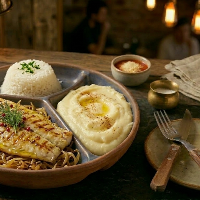 Grelhada na manteiga, salteada na cebola, servida com farofa, vinagrete, fritas e arroz maluco