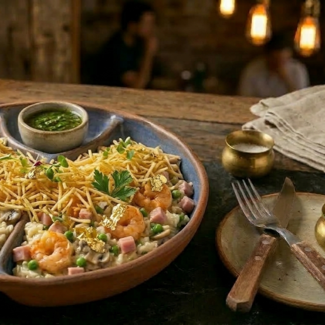 Arroz a piamontese, camarao, ervilha, presunto, champignon e batata palha