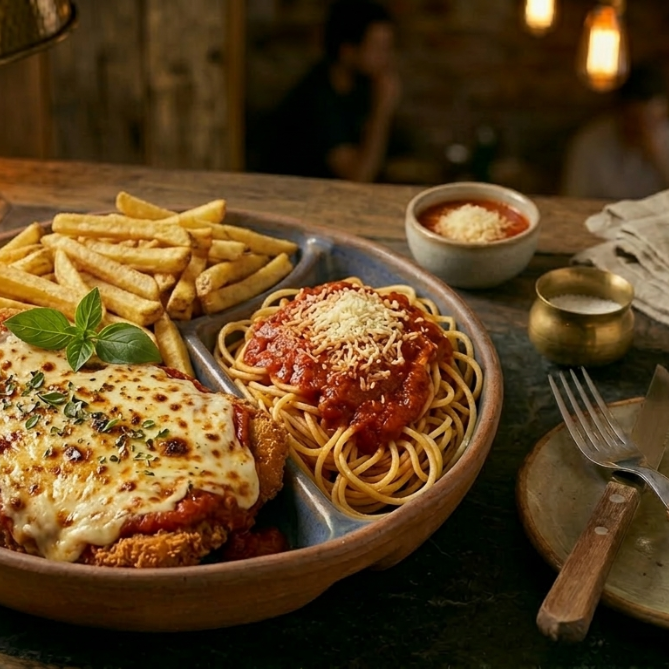 Frango empanado e gratinado com queijo e molho de tomate, servido com espaguete, acompanha fritas ou pure