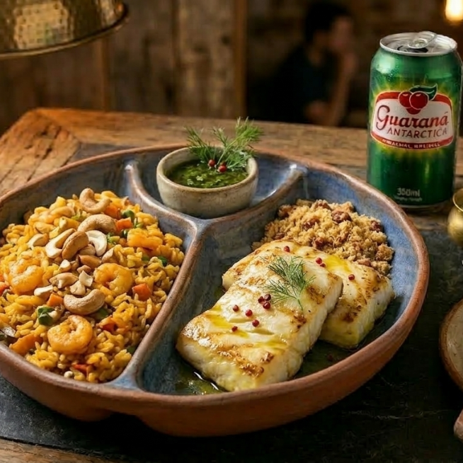 Pescada amarela grelhada no azeite, acompanhada de arroz de moqueca de camarao e castanhas