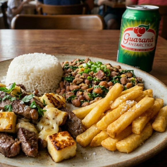 em cubos salteada na manteiga com queijo coalho servida com arroz maluco feijao tropeiro e fritas