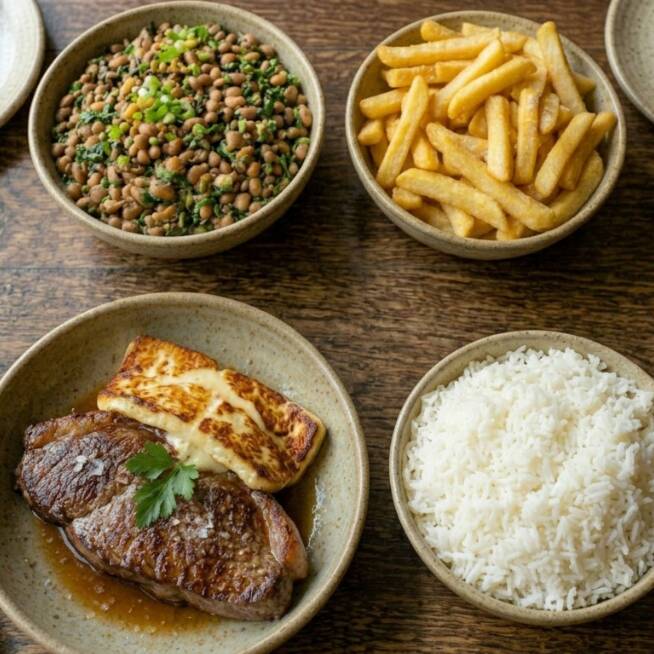 Feijão macassar, arroz branco, farofa, vinagrete, batata frita